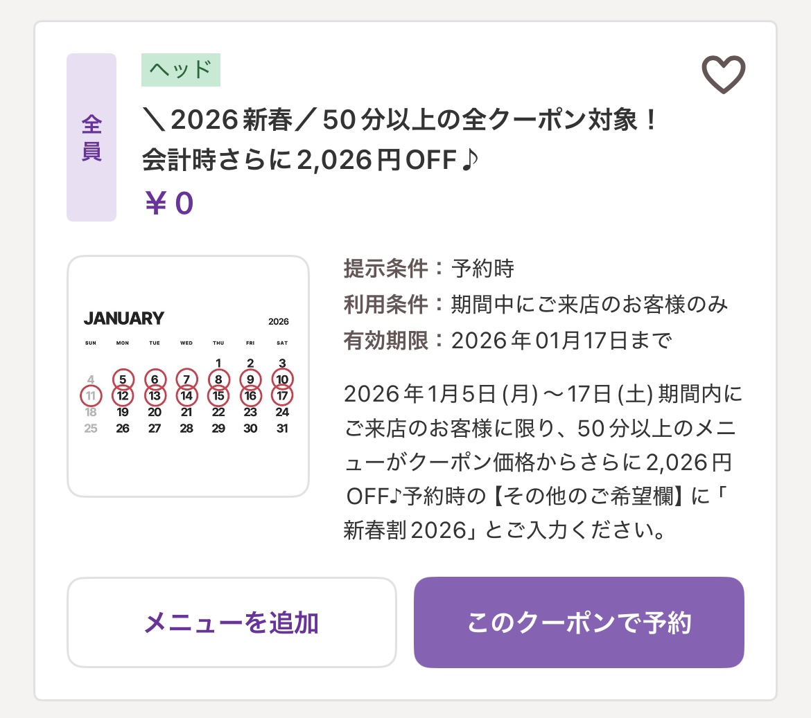 予約時にご希望のクーポンを選択 → 予約画面の【その他のご希望欄】に『新春割2026』とご入力くださいませ。